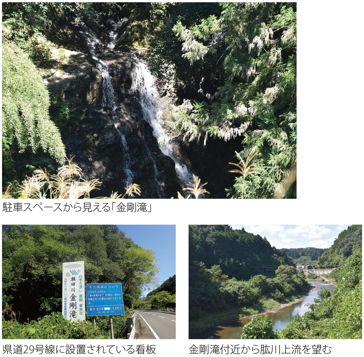 「金剛滝」は、愛媛県西予市を流れる肱川支流の瀬田川にかかる落差10mの滝です。うっそうとした森の中にあり、滝の近くまでは行けませんが、広い駐車スペースから見ることができます。