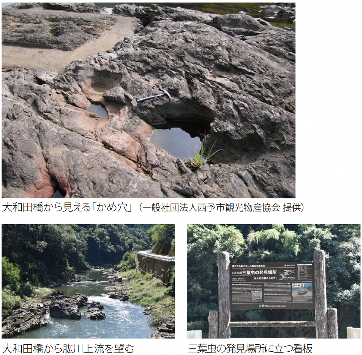 西予市野村町の県道29号線「大和田橋」からを川岸を見下ろすと、岩石に大きな穴が点々とあるのが見えます。これは、川底のくぼみに入った小石が急流で転がってできた「かめ穴」です。このかめ穴が観察できる地質は、約4億年前の黒瀬川構造帯の一部に含まれます。さらに「大和田橋のかめ穴」の上流では、約4億2,500万年前の三葉虫の化石が、愛媛県で初めて発見された場所があり、道沿いには看板が設置されています(駐車場はありません)。