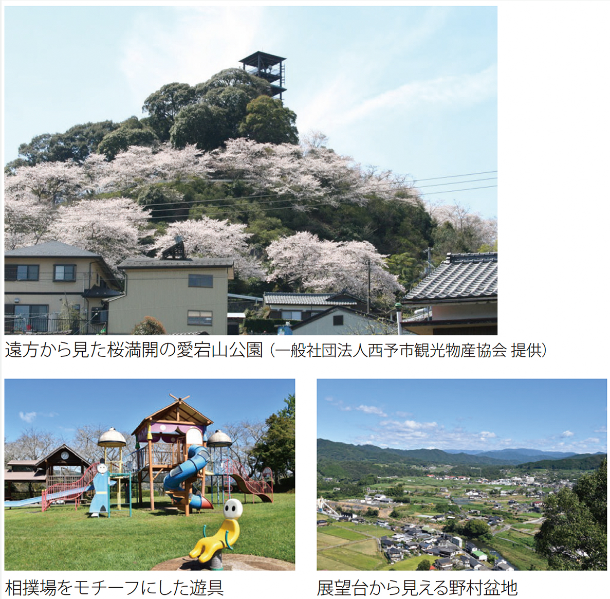 「愛宕山公園」は、西予市野村町愛宕山の頂上に設けられた四季折々の風景が楽しめる公園です。桜やツツジが約1万本植栽されており、町民の憩いと安らぎの場となっています。また、相撲場をイメージした総合遊具も設置され、小さな子供連れの家族でも楽しむことができます。