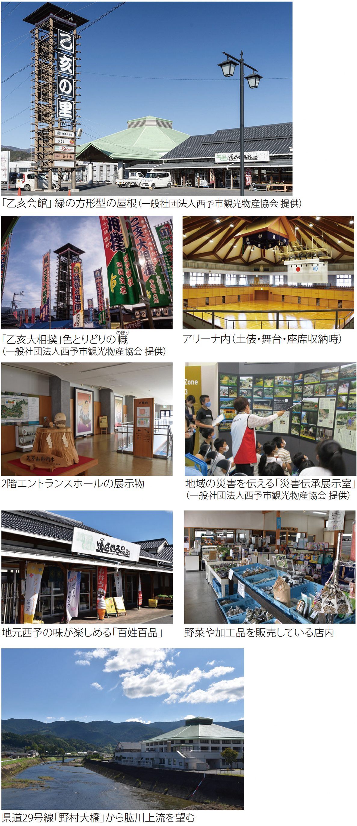 館内受付は2階にあり、「相撲資料館」では歴代力士写真や手形など、乙亥大相撲に関する資料展示を無料で見ることができます。1階に降りると有料で利用できる相撲練習室、トレーニング室、会議室などがあります。「災害伝承展示室」では、平成30年7月豪雨による災害を含め、西予市の過去の災害の歴史や防災に関する情報がパネルや映像で無料見学できます。当展示室は、2024(令和6)年9月に、国が創設した第1回「NIPPON防災資産」に認定されています。