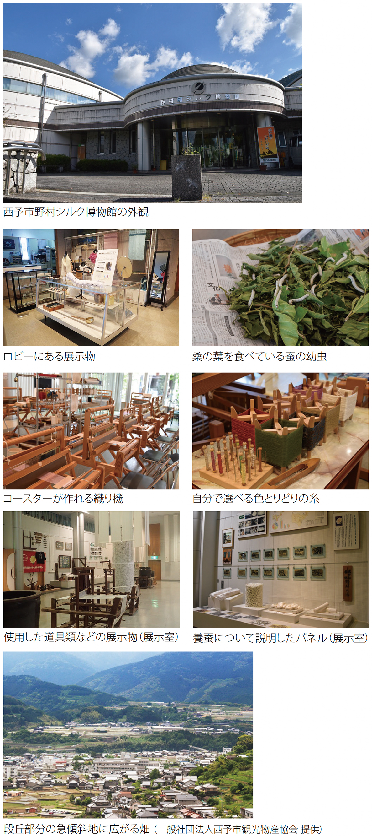 「西予市野村シルク博物館」では、シルクの町として国内外で高い評価を得ている野村町の歴史について学ぶことができます。野村町の河成段丘(かせいだんきゅう)が広がる急傾斜地では、稲作より桑栽培に適していたことから収益性の高い養蚕(ようさん)が明治初期から急速に広まりした。肱川の清らかな水と高度な製糸技術によって生産された野村生糸は、「カメリアシルク」の商標で販売されています。かつてはエリザベス2世の戴冠式のドレスに使用され、古くから皇室や伊勢神宮の式年遷宮の御料糸(ごりょうし)として選ばれてきた生糸は、2016(平成29)年に「伊予生糸(いよきいと)」としてG(I 地理的表示保護制度)に登録されています。