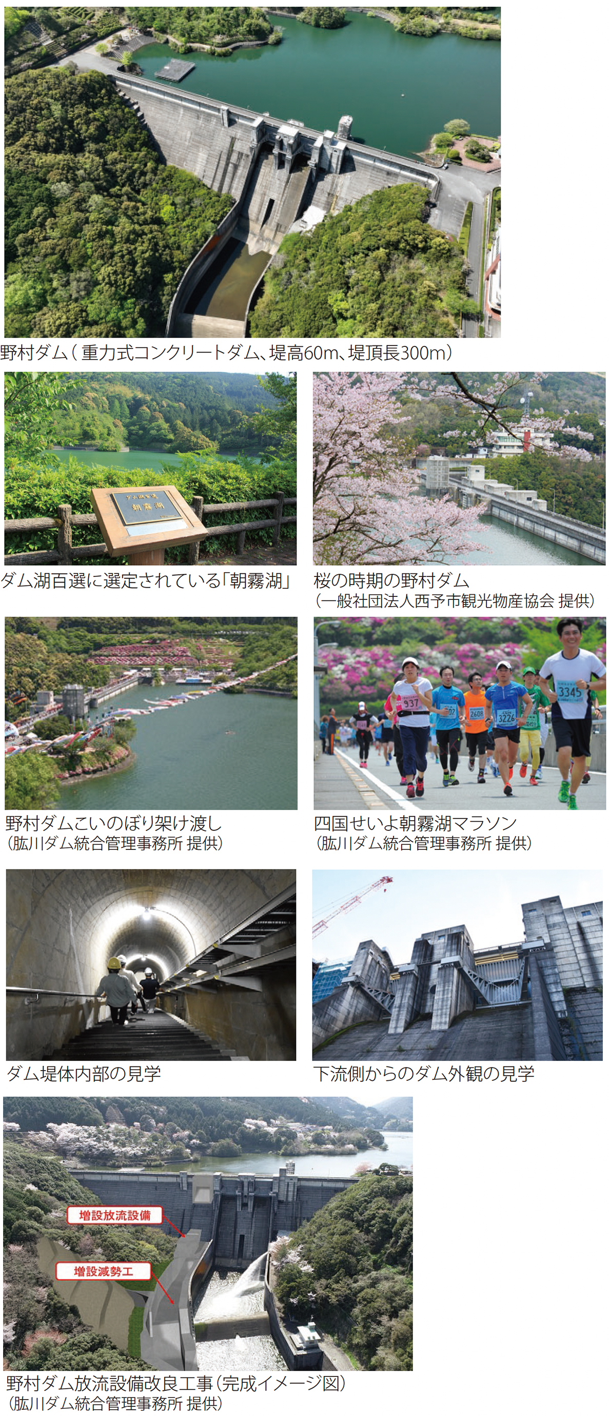 現在、洪水調節機能の強化を目的とした「野村ダム堰堤改良事業」を2023(令和5)年2月より実施しています。国内2例目の「浮体式上流仮締切」を導入した放流設備改良工事が、2027(令和9)年度に完成する予定です。