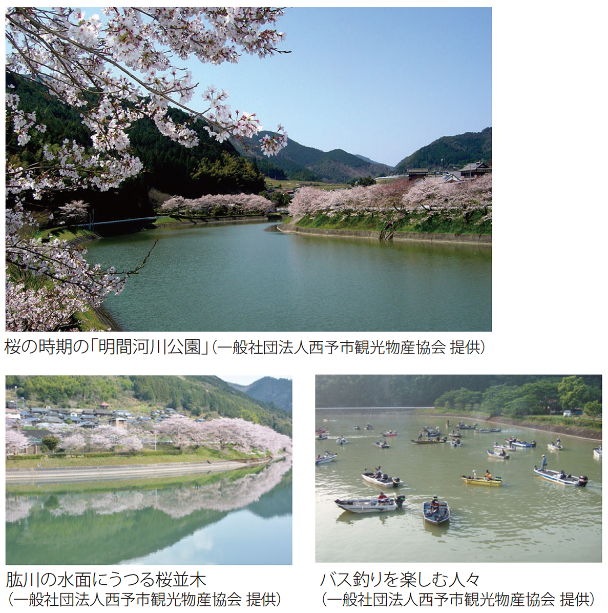 県道29号線沿いにある「明間河川公園」は、野村ダム上流(宇和町明間)の肱川沿いにある整備された公園で、ソメイヨシノ約450本が咲き乱れる桜の名所です。満開時には、イルミネーションや桜のライトアップなど人気のお花見スポットになっています。