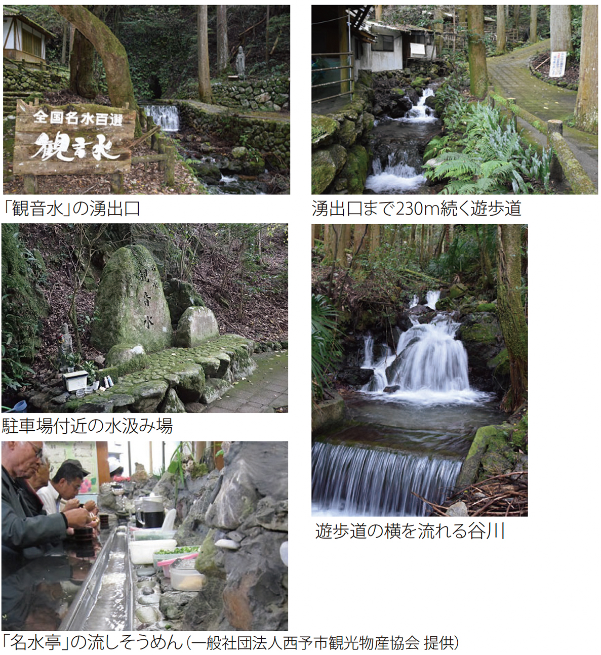 「観音水」は、の明間(あかんま)河川公園から約1.5km南下した場所にあります。鍾乳洞からの湧水(ゆうすい)が肱川に注いでいます。水量は日量約8,000トン、水質は弱アルカリで、水温は年間を通じて14℃に保たれています。1985(昭和60)年に全国名水百選に選ばれ、名水を求めて多くの人がこの場所を訪れます。奥の湧出口までは遊歩道が整備されていますが、足元が滑りやすいのでご注意ください。観音水を利用した「名水亭」の流しそうめんを期間限定で食べられます。