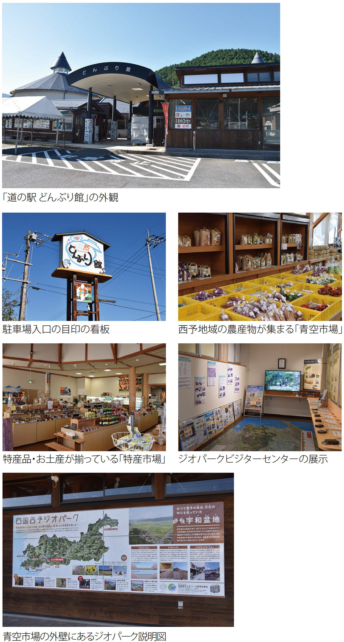 2014(平成26)年4月、愛媛県内で27番目に登録された道の駅「どんぶり館」は、西予宇和ICを下りて野村方面へ300mへ行くと駐車場入口に大きな看板があります。西予市の特産品を一同に集めて販売しており、ここでしか買うことができない地元産商品が目白押しです。