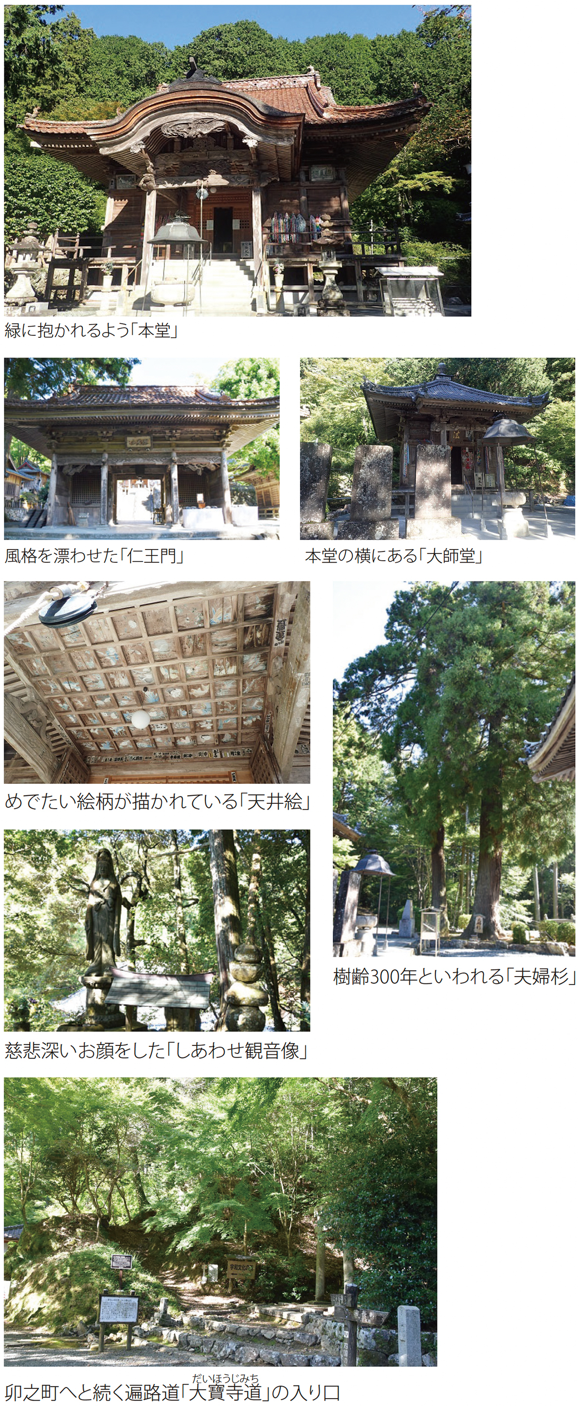 仁王門の手前を右奥に行くと「しあわせ観音像」へ続く参道があり、周囲には西国三十三所の石像が並んでいます。仁王門の手前左に行くと遍路道の「大寶寺道(だいほうじみち)」の入り口が見えます。遍路道を歩くと約30分でJR卯之町駅に着きます。