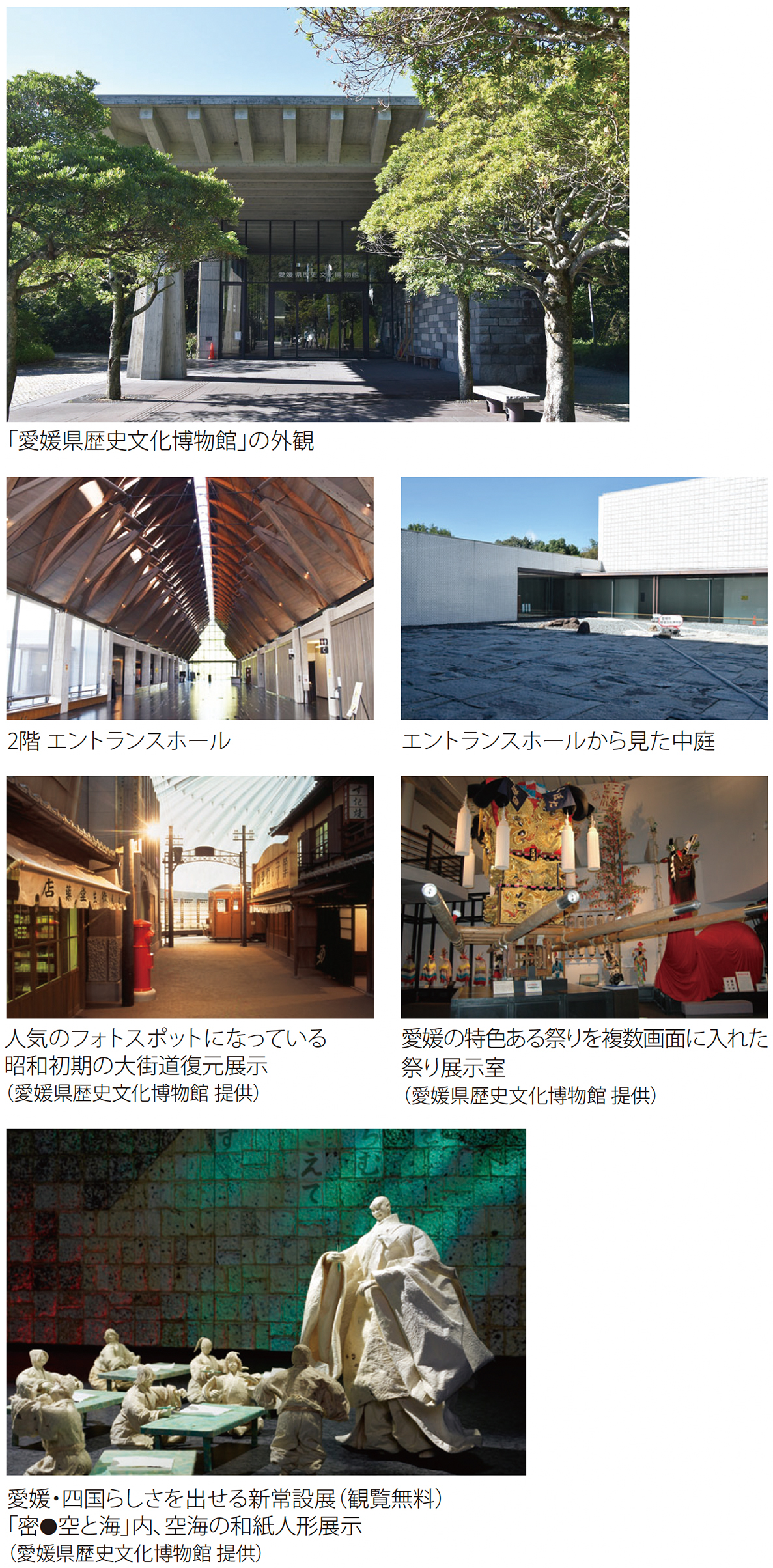 常設展では2つのゾーンに分けて紹介しています。「歴史展示ゾーン」は、旧石器時代から近・現代までの愛媛の歩みを広い館内を活かした実物大復元模型の展示が多く、戦前の松山市大街道の町並みの再現では、実際に建物内に入って当時の雰囲気を味わうことが出来ます。「民俗展示ゾーン」は、愛媛県内の多彩な祭りや芸能、四国遍路などを模型や映像で紹介しています。さらに年に4回、「特別展」を開催しています。