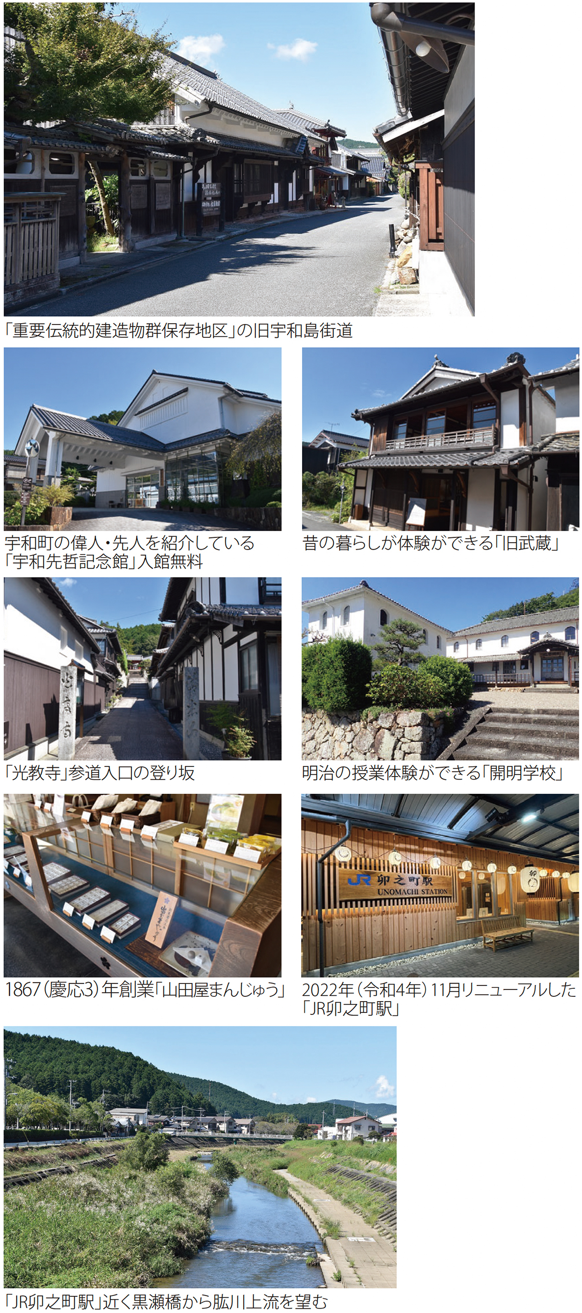 「卯之町の町並み」は、JR予讃線「卯之町駅」からすぐのところにあります。かつて宇和島藩の在郷町・宿場町として栄え、現在も江戸や明治時代から続く老舗旅館や造り酒屋、醤油屋などが営業し、地元住民や観光客で賑わっています。国の重要伝統的建造物群保存地区に選定された町並みを中心に、博物館や文化財など、見ごたえある施設が多いのが特徴です。