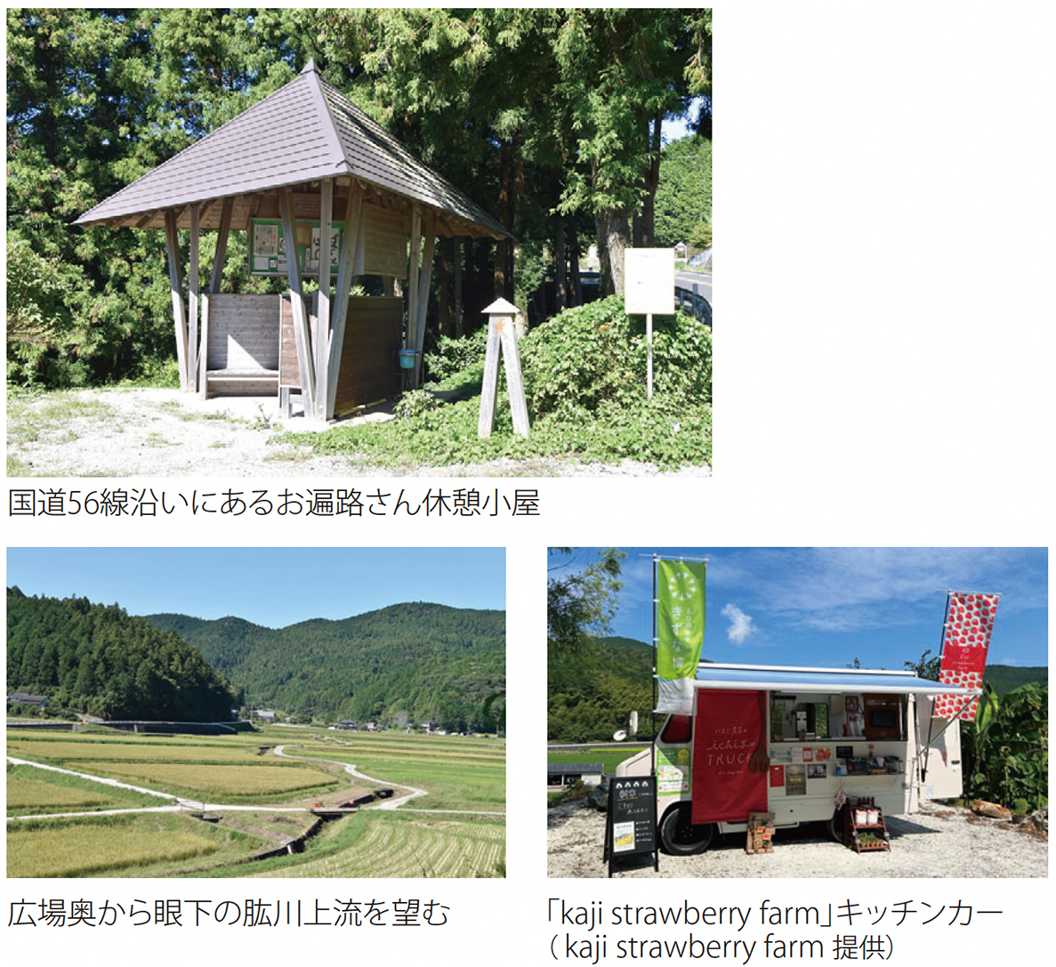 「お遍路さん休憩小屋 第49号ひじ川源流の里」は、四国霊場43番札所の明石寺(めいせきじ)から約10kmの地点にある見晴らしの良い休憩所です。地元檜を使用した三角屋根の目立つ建物で、2023(平成25)年12月に設置されました。広場の奥は、「kaji strawberry farm」キッチンカー専用出店スペースとなっており、地元宇和町のいちご農家が作る「いちごスムージー」を販売しています。また、目の前に広がっている田んぼの中を流れる肱川を見ることができます。この遍路小屋から大洲方面に70mほど行くと旧遍路道である鳥坂峠(とさかとうげ)へ入る分岐点があります。鳥坂隧道は、昔から中予から南予に向かうための街道の交通の要所であり、峠越えの難所でもあります。