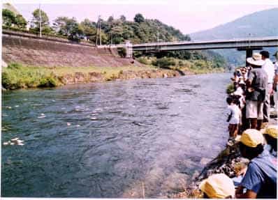 流れ下るアメゴ板を見る参加者