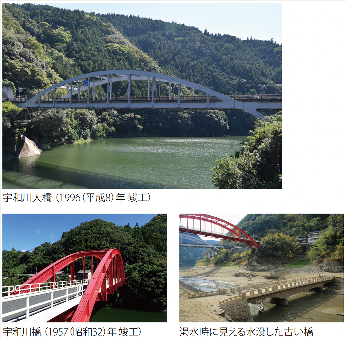 「宇和川大橋」は、国道197号(鹿野川道路)の坂石トンネルと栗の木トンネルの間に架かっています。橋の名前は、支流の黒瀬川との合流地点より上流の肱川を「宇和川」と呼んでいることが由来のようです。渇水で鹿野川湖の水位が低下すると、県道29号宇和野村線の終点に架かる「宇和川橋」付近では、鹿野川湖に水没した古い橋が見えてきます。